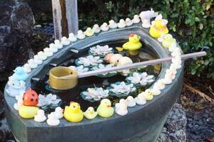 楽しい落ち葉のアート 『大井神社』 亀岡市にある大井神社は、祭神が保津川を鯉に乗って上がってきたと伝えられ、この地域ではでは鯉が神の使いと考えられ、鯉を食べず、鯉のぼりも揚げない風習が伝わっている。境内はイチョウの落ち葉で、来年の干支の馬をはじめ色々なアートが作られ参拝者を楽しませている。